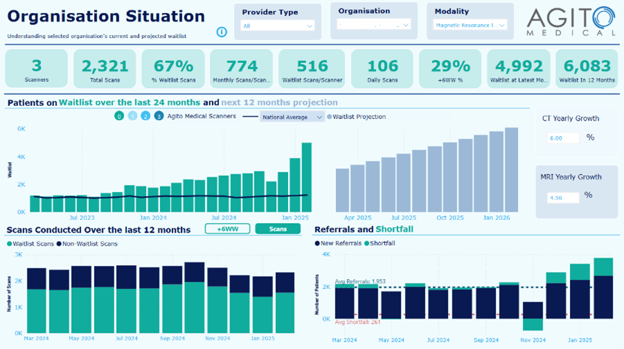 The solution enabled users to analyse scan volumes, waitlists, equipment distribution, competitor presence, and regional performance metrics, all in one place.